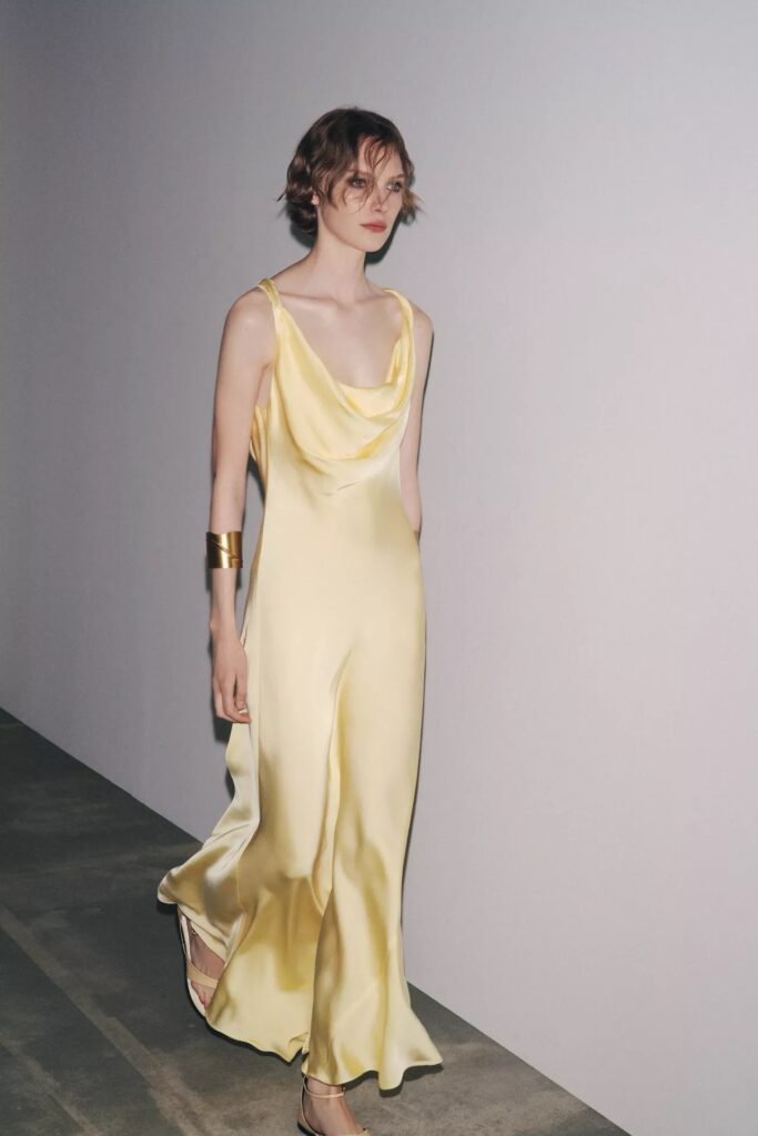 This dress is perfection. The front has a very flattering cowl neck with a dip. I’m surprised that I also remember where I first saw this one – Remi Bader wore it in Italy. Quality for the price is literally insane. True to size. I have it in a medium.